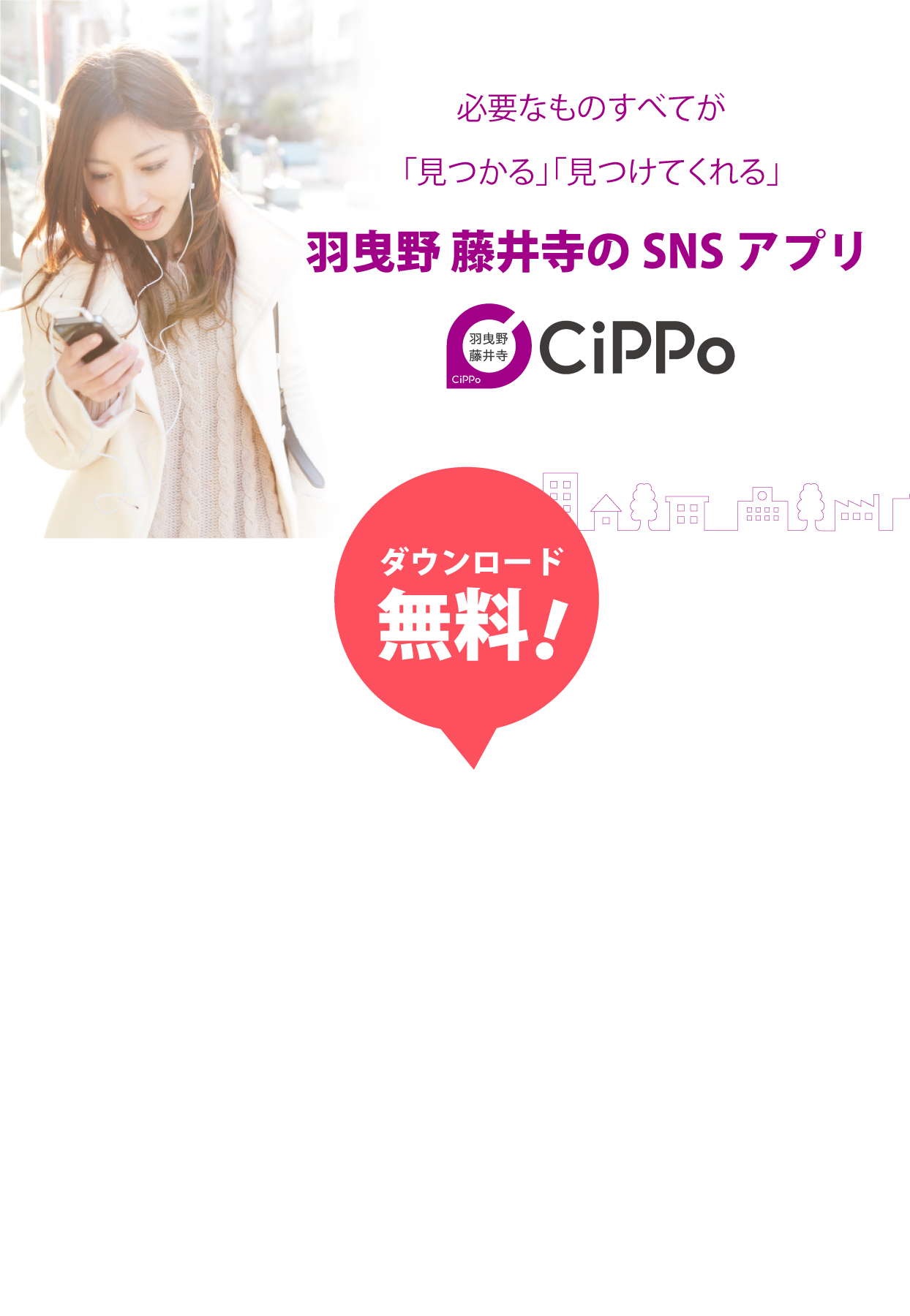 羽曳野 藤井寺の市民と、店舗や事業者そして役所をつなぐスマートフォン用アプリです。SNSでの連絡先交換や友達登録は不要!CiPPoならお得な情報を受け取ることができ、チャットで連絡したりタイムラインを見たりすることが可能です!緊急の防災・防犯情報も、プッシュ通知で届くから見逃さずに安心!羽曳野 藤井寺のすべての情報がここに!