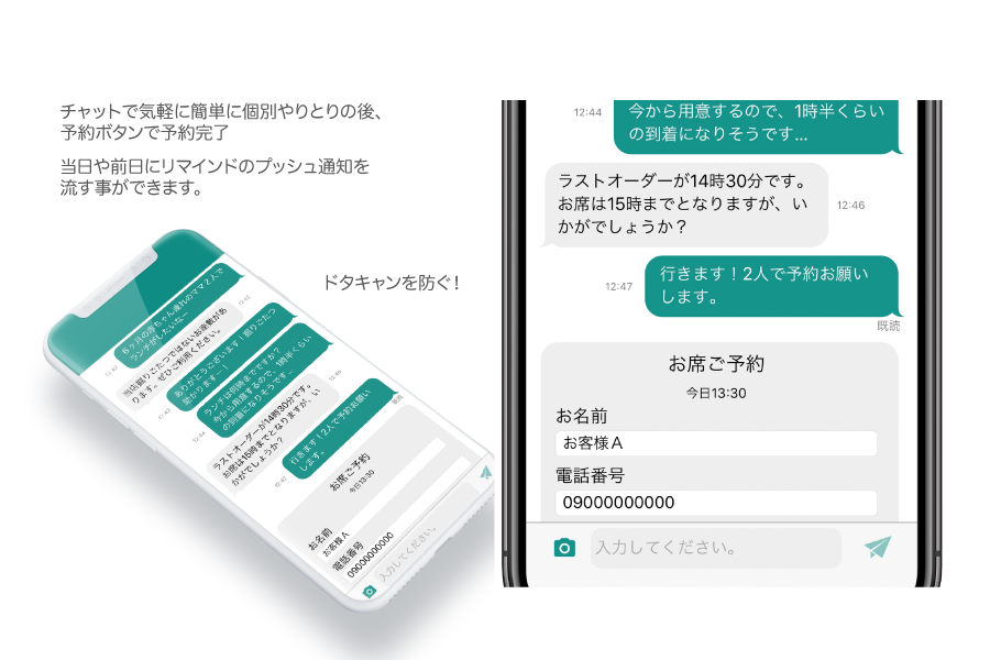 個別対応による店舗側とのやりとりで、店舗予約と求人面接予約の際の流れをチャットによって見える化 し、要望や疑問・不安点なども事前に解決できます。