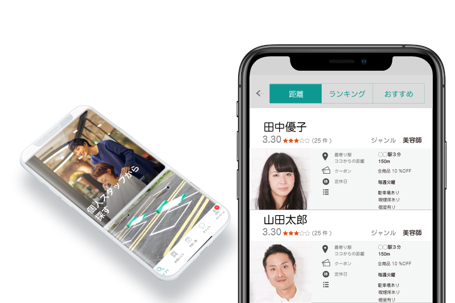 美容室、医師、不動産、習い事塾、マッサージ、士業、バーなど最終的に個人マッチングする業種はスタッフで探すページに登録できユーザーは、趣味思考や経歴などで合う方を見つけチャットで予約がでます。